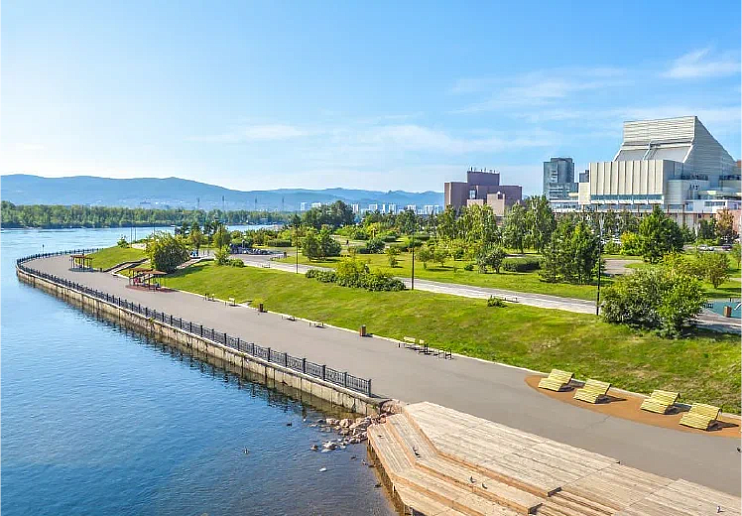 Зеленая набережная и пеший променад от Стрелки до Четвертого моста. Красноярск-Сити расширит любимое место прогулок.